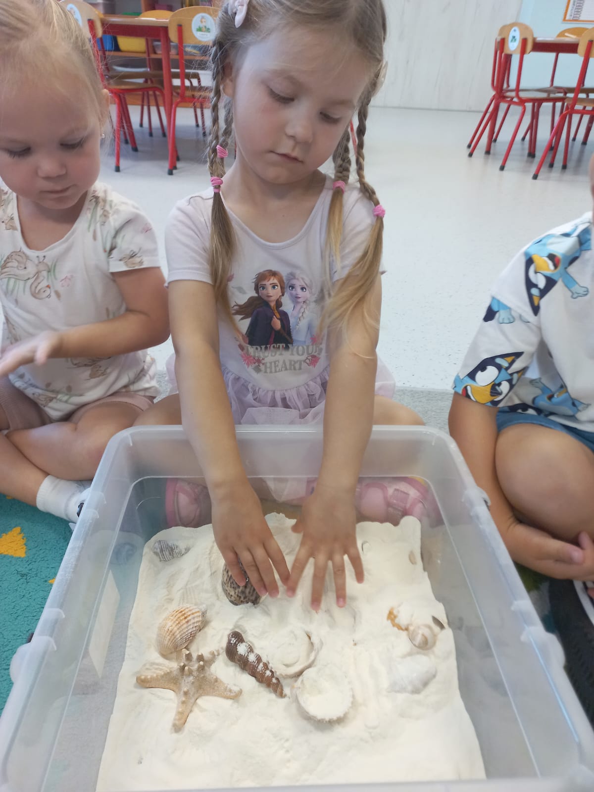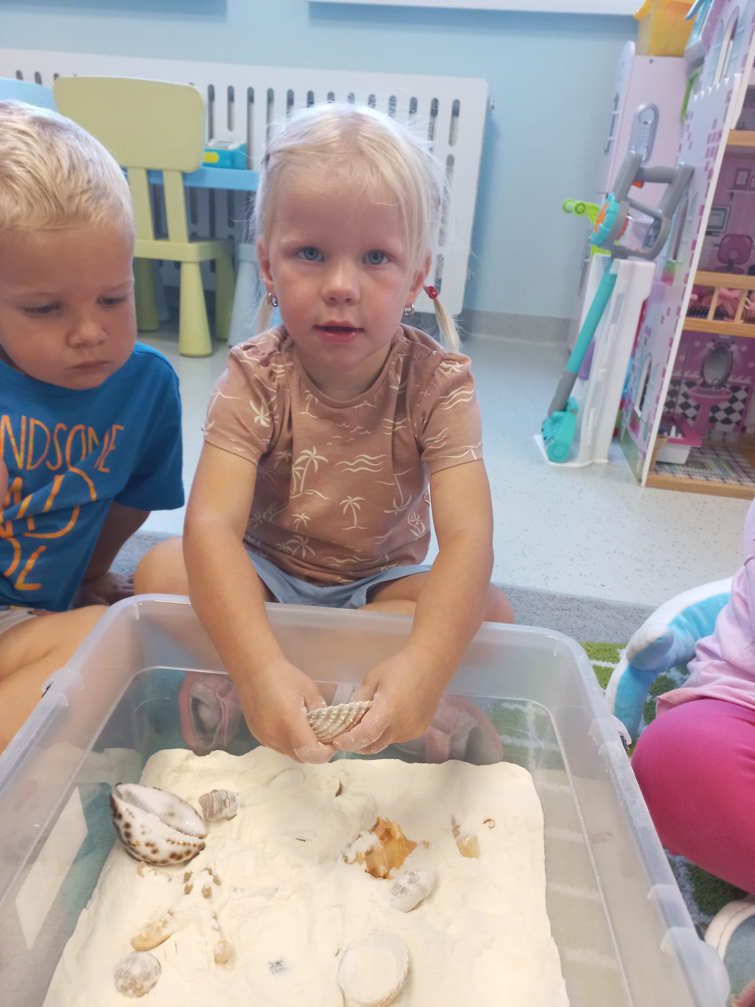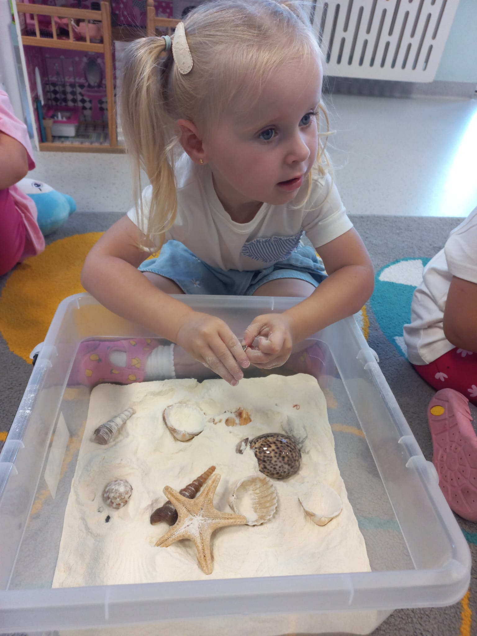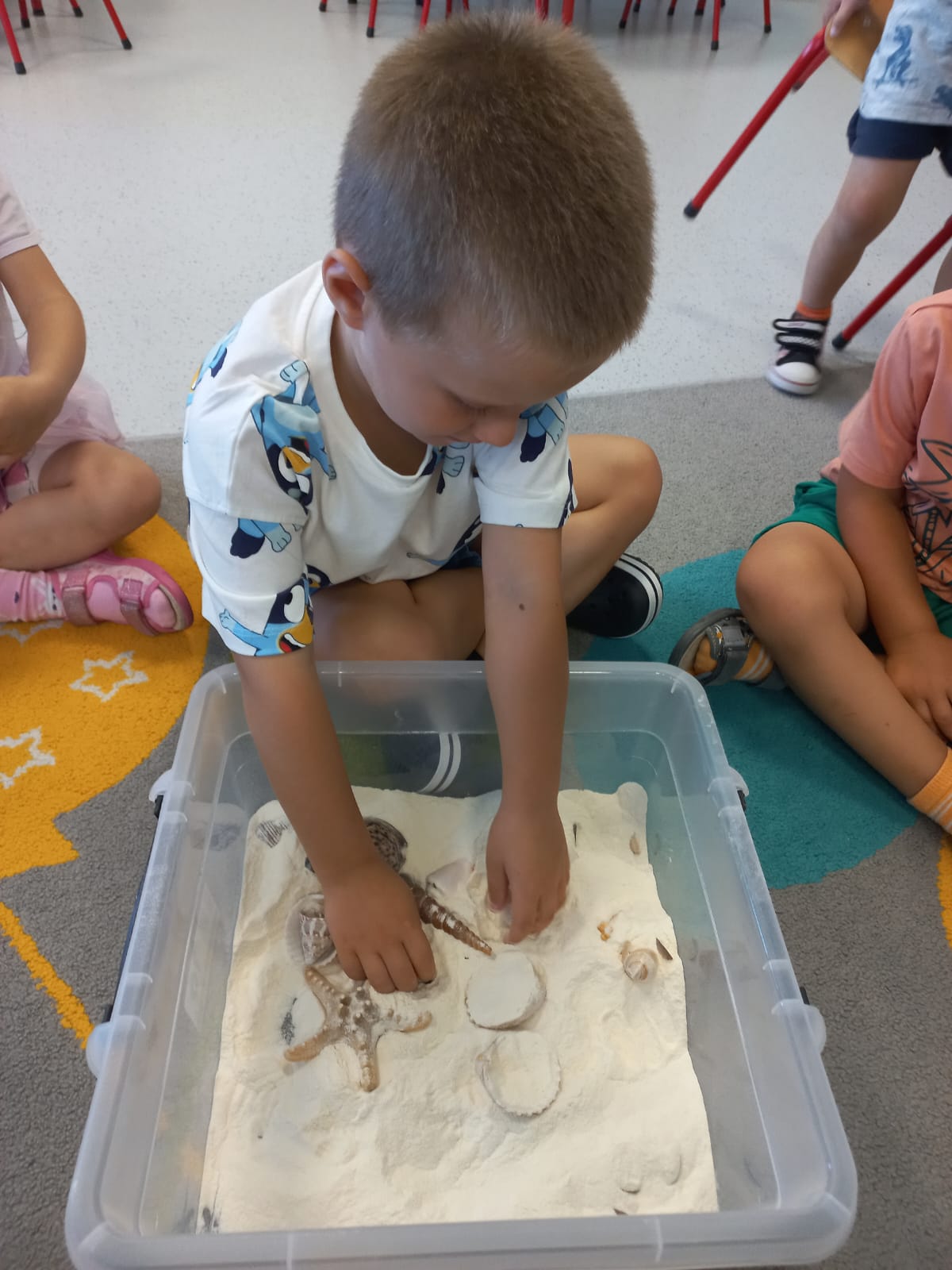 W pierwszym tygodniu dzieci wspominały wakacje. Skorzystały z sensorycznych zabaw bawiąc się w poszukiwanie morskich skarbów.