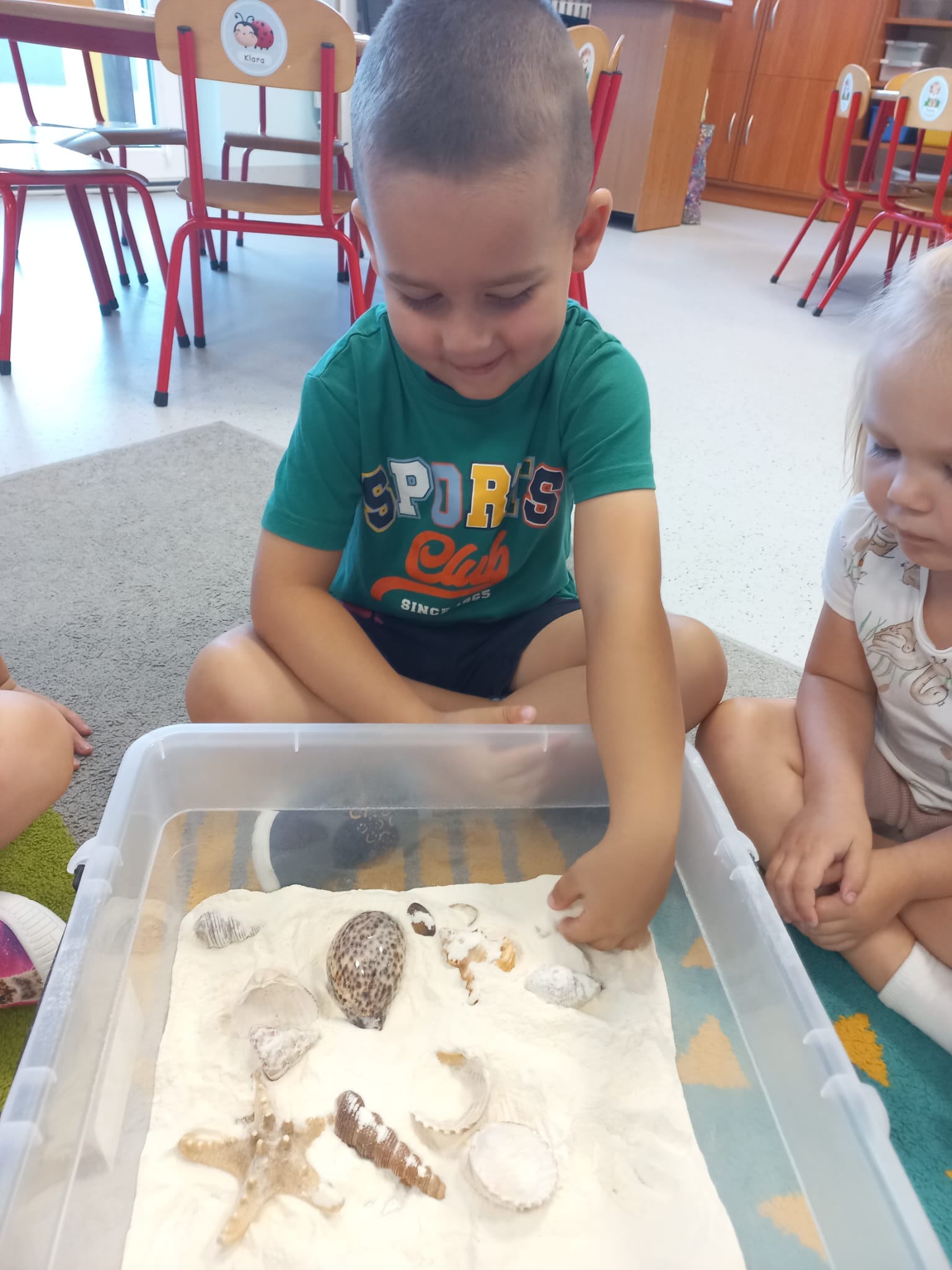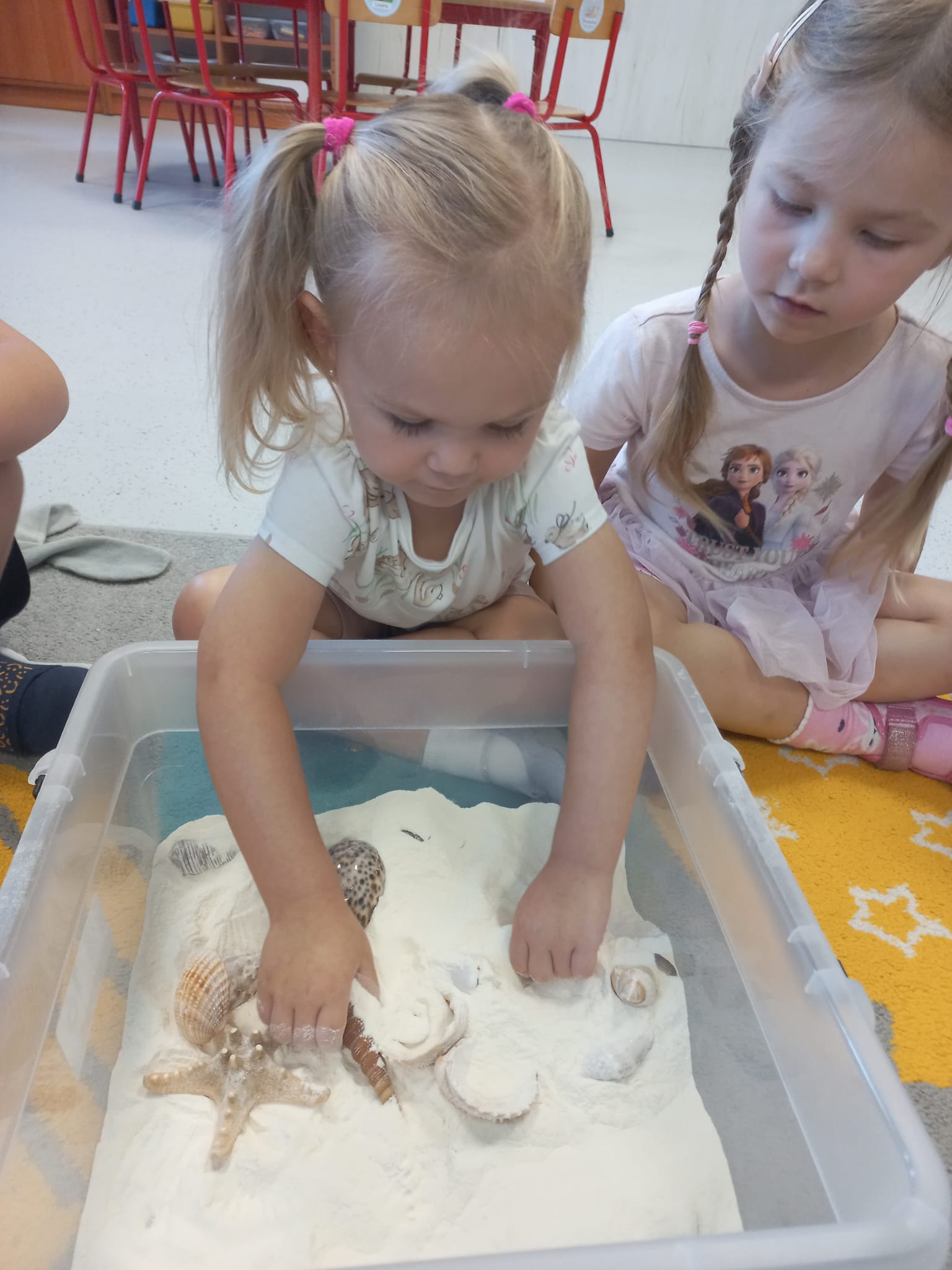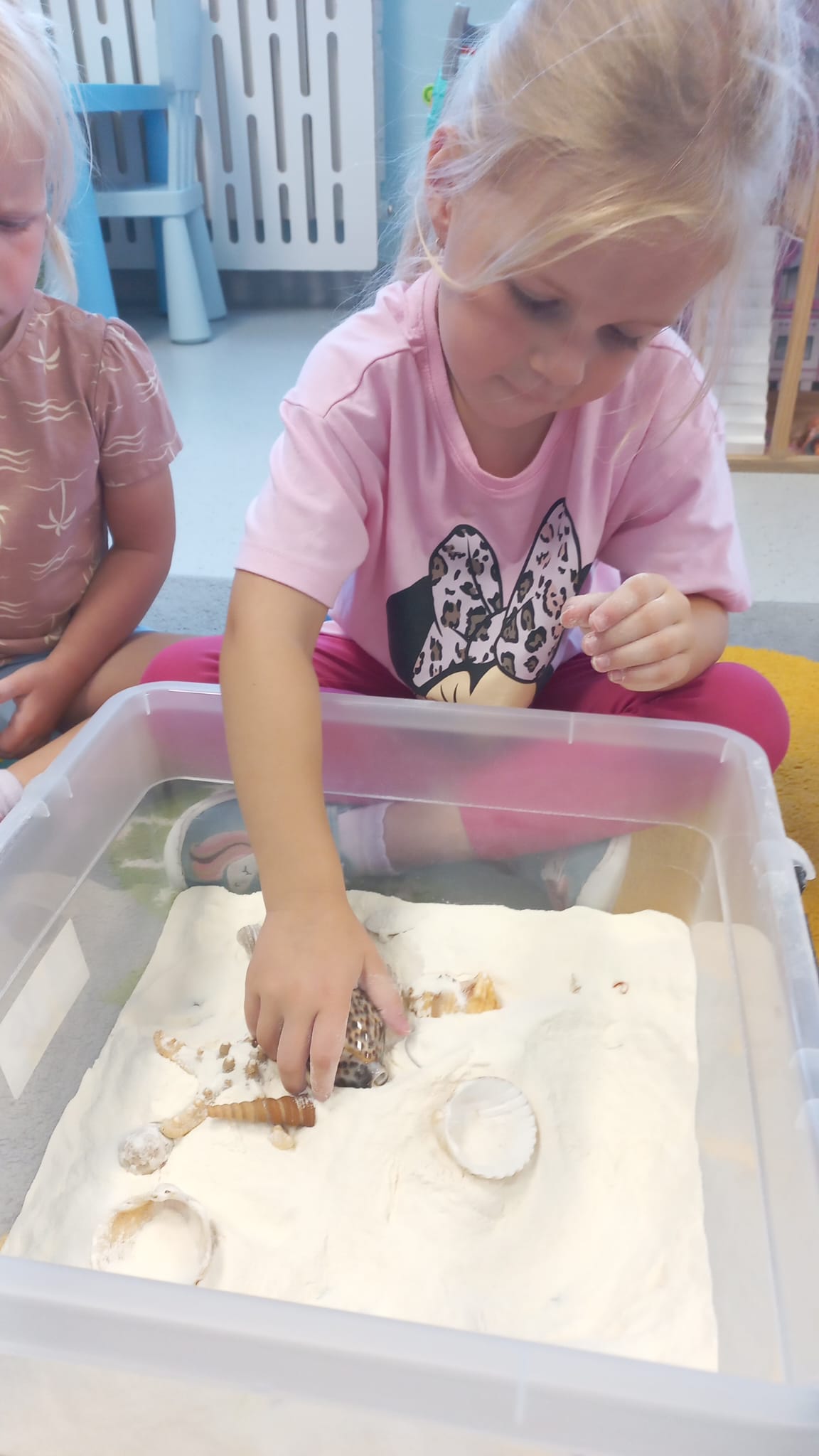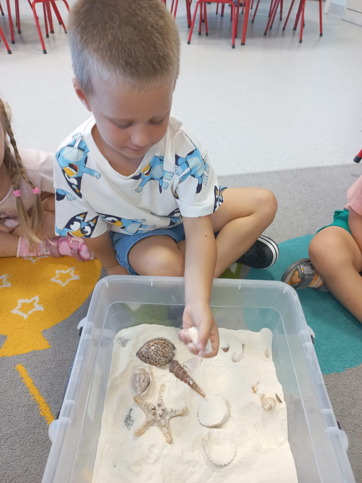 W pierwszym tygodniu dzieci wspominały wakacje. Skorzystały z sensorycznych zabaw bawiąc się w poszukiwanie morskich skarbów.