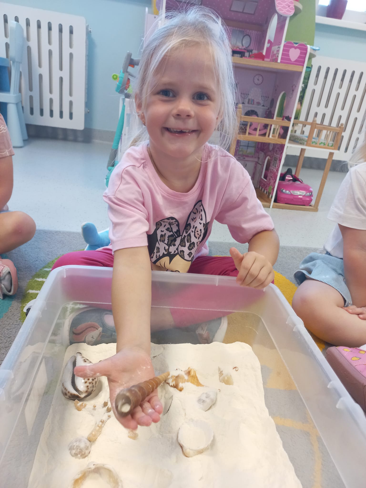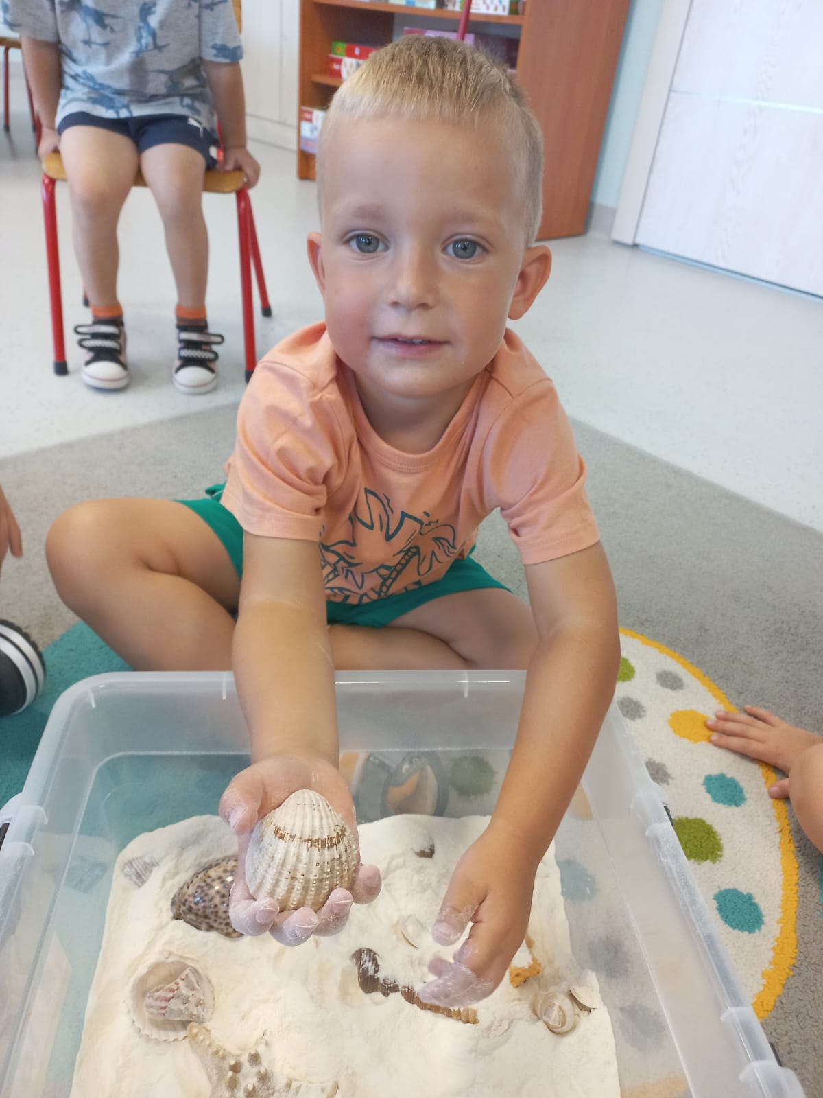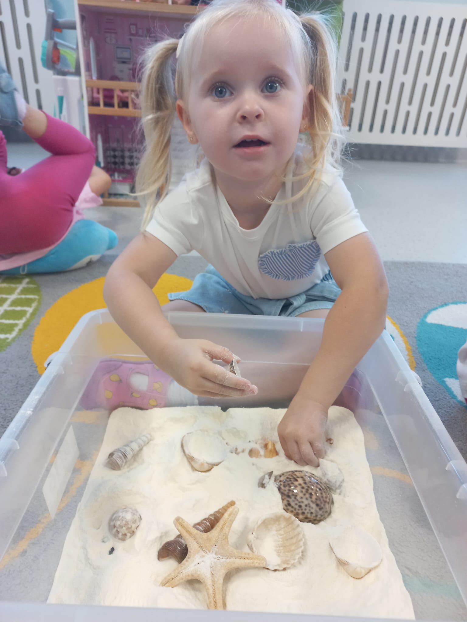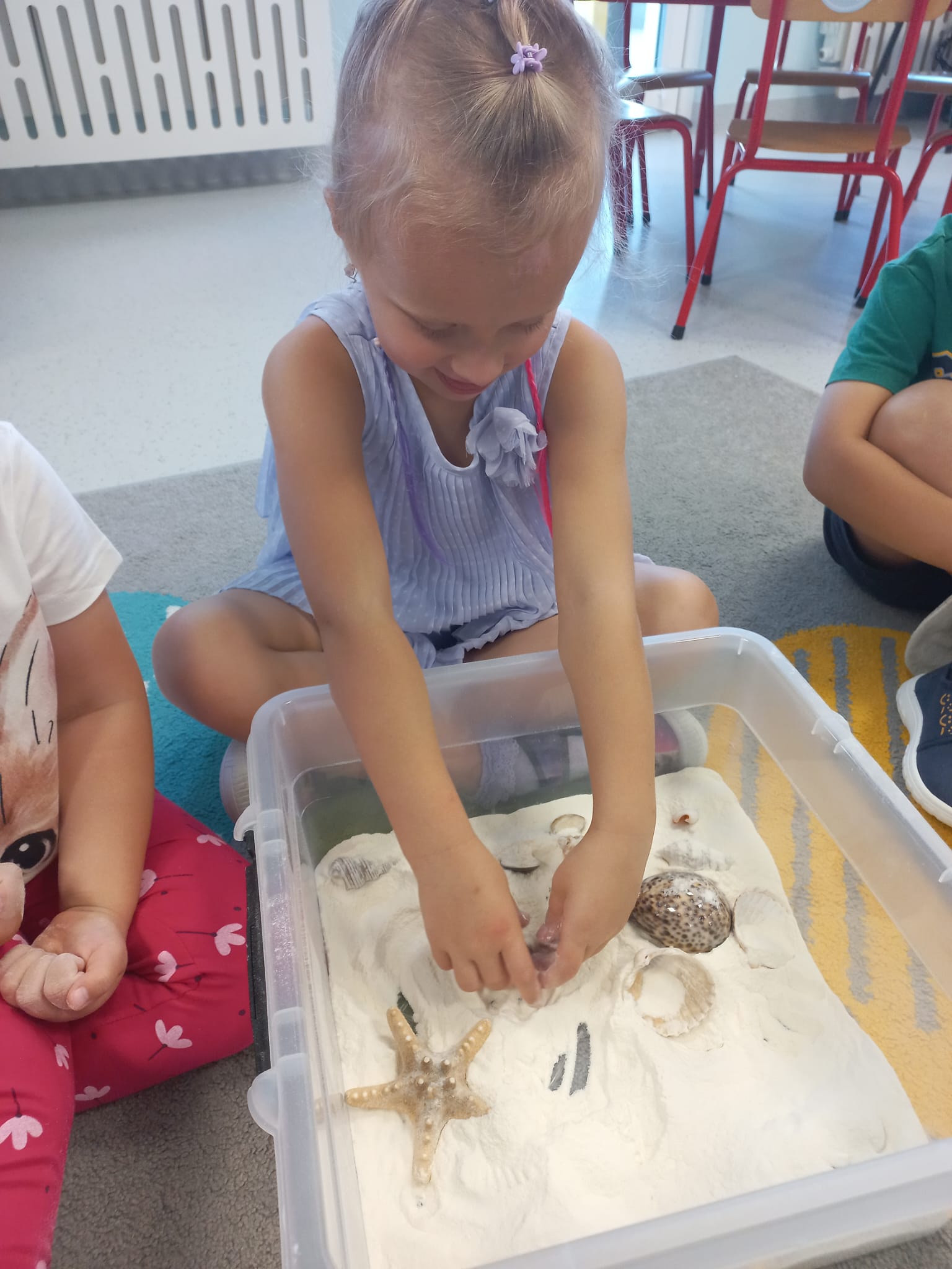 W pierwszym tygodniu dzieci wspominały wakacje. Skorzystały z sensorycznych zabaw bawiąc się w poszukiwanie morskich skarbów.