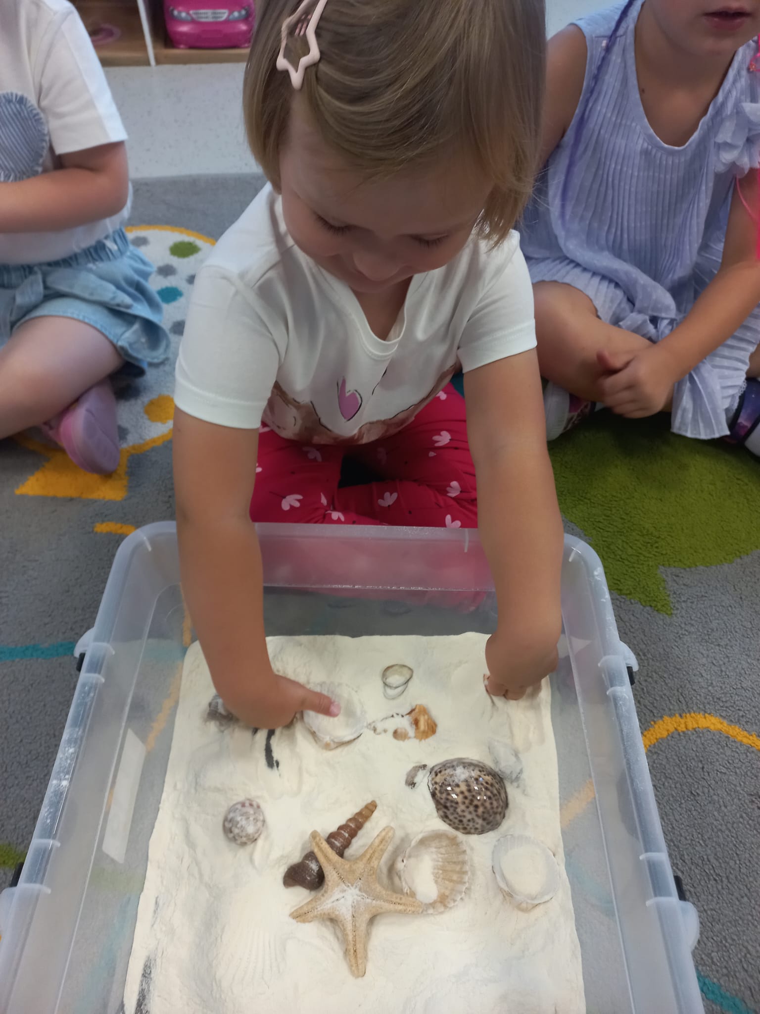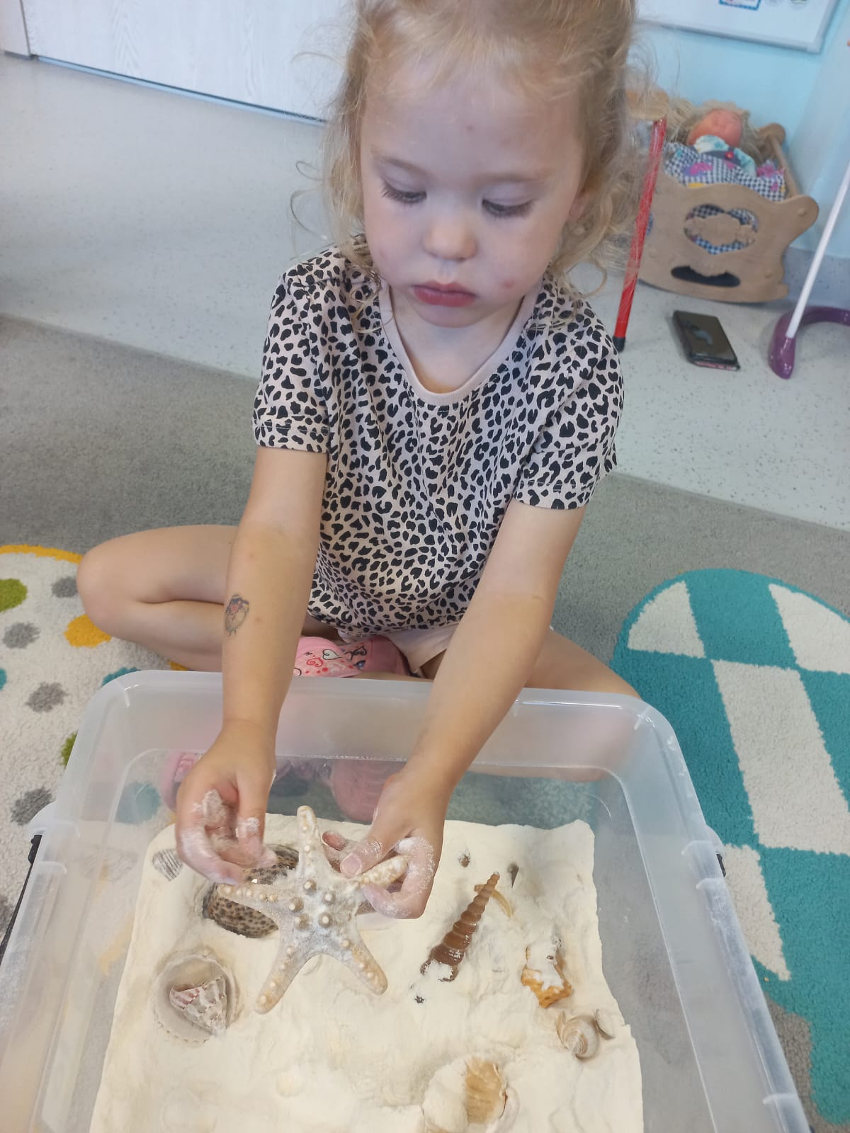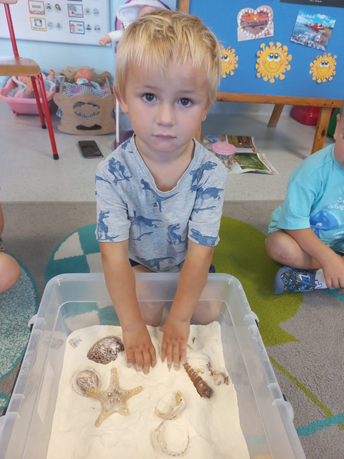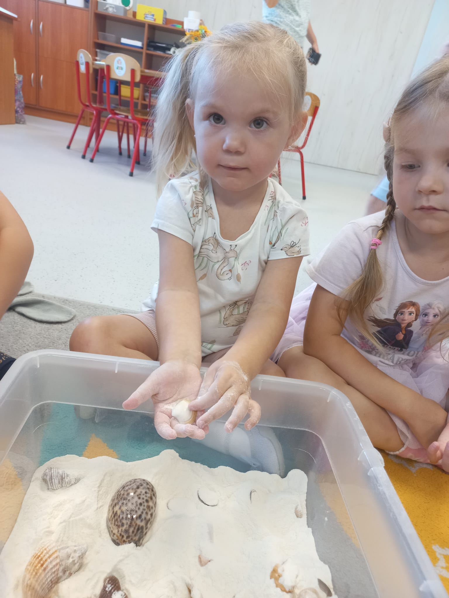 W pierwszym tygodniu dzieci wspominały wakacje. Skorzystały z sensorycznych zabaw bawiąc się w poszukiwanie morskich skarbów.