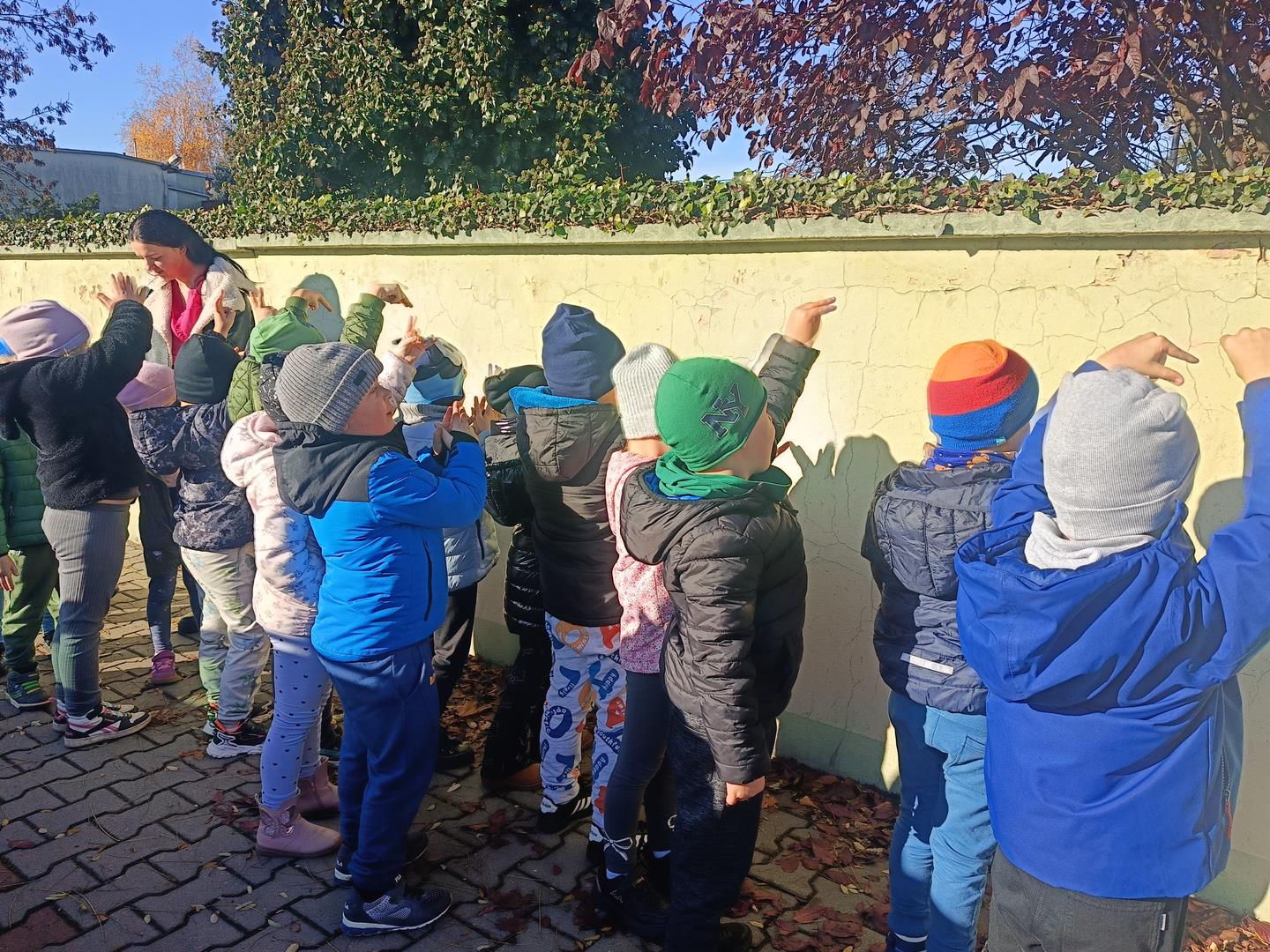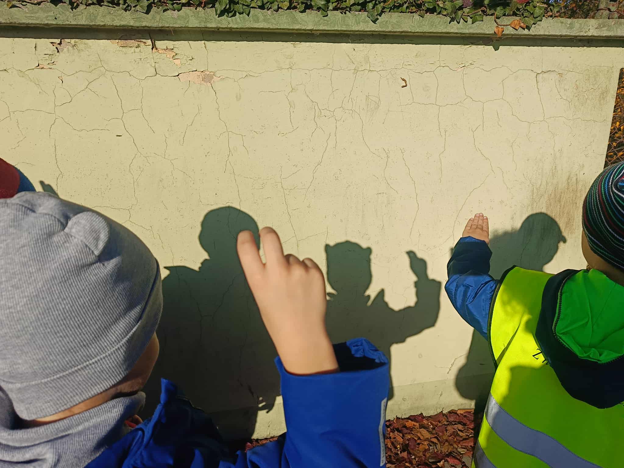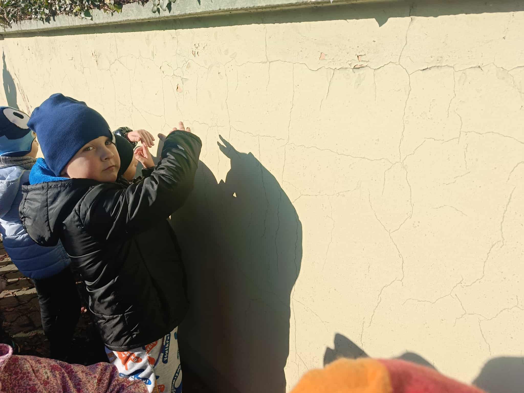 Podczas dzisiejszego spaceru dzieci z naszej grupy zupełnie przypadkiem odkryły niezwykły świat… cieni! Słońce świeciło pięknie, a na chodniku i murku pojawiały się różne kształty. Przedszkolaki z wielkim zaciekawieniem zaczęły eksperymentować – wystarczył ruch ręki, palców lub całej sylwetki, a cień natychmiast zmieniał swój kształt!