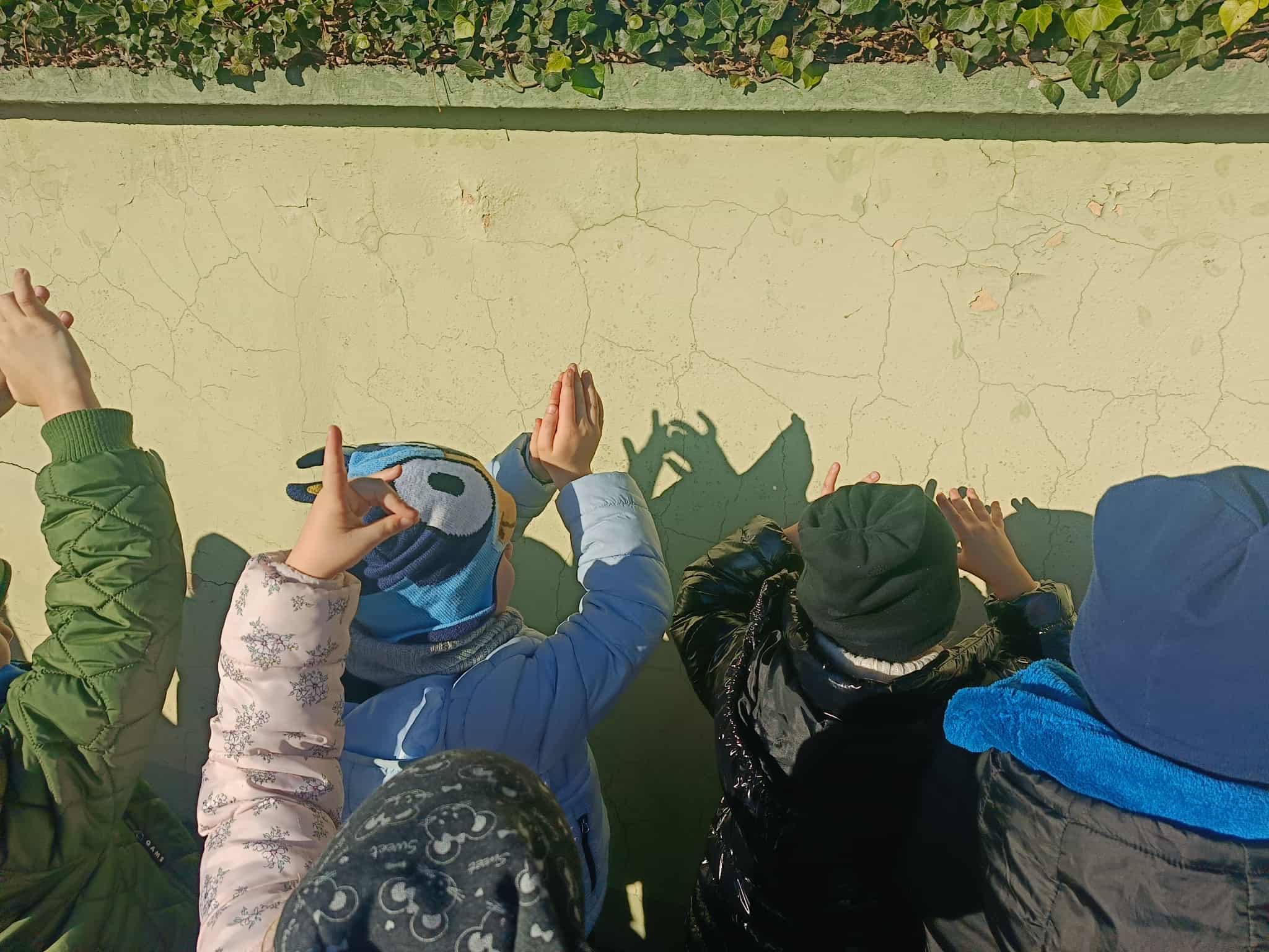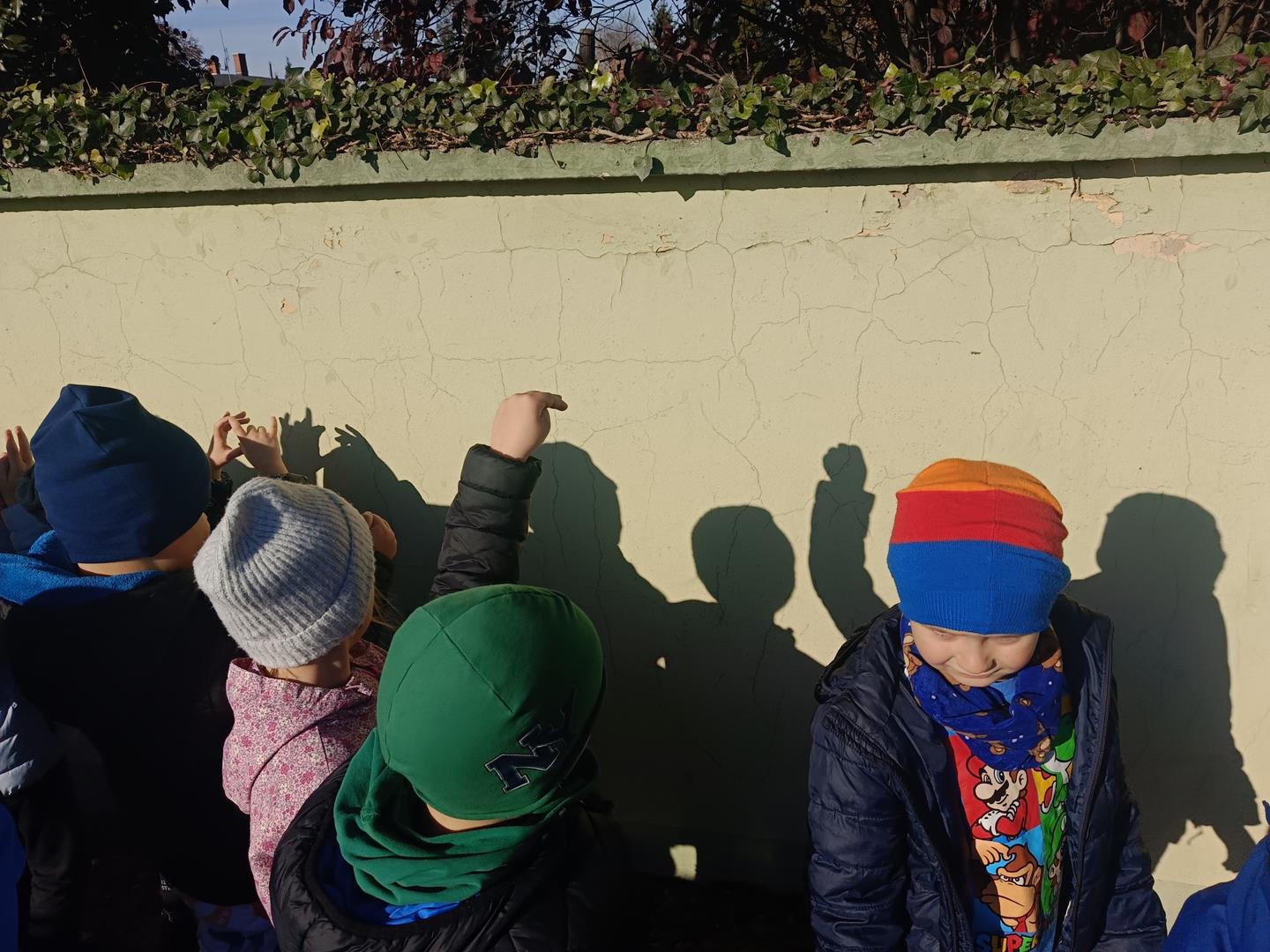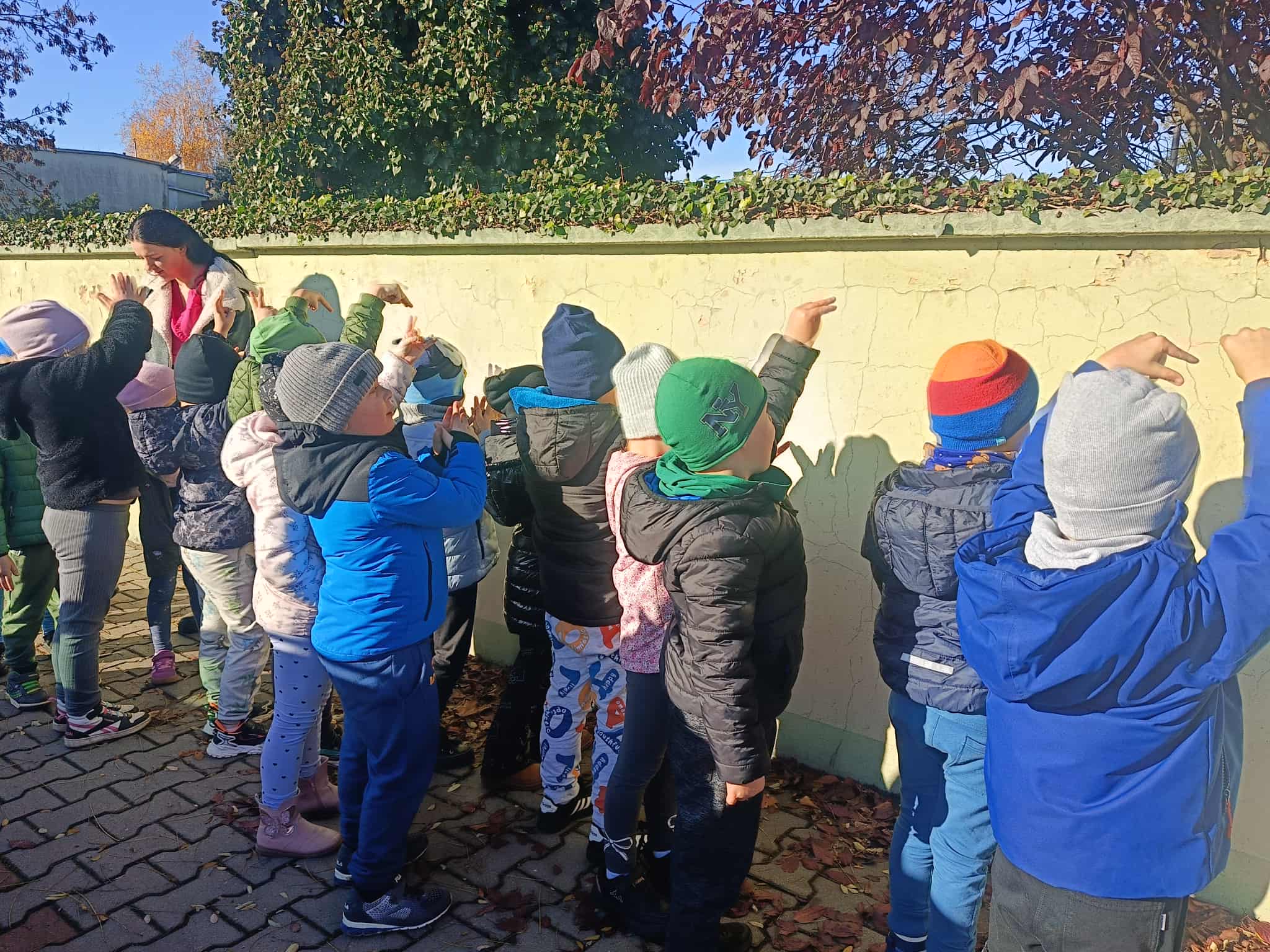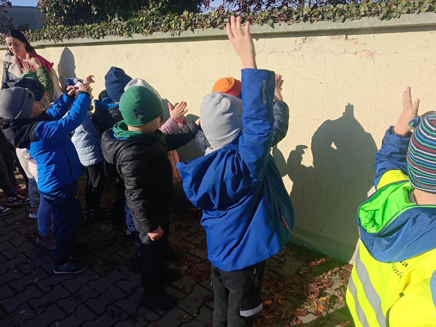 Podczas dzisiejszego spaceru dzieci z naszej grupy zupełnie przypadkiem odkryły niezwykły świat… cieni! Słońce świeciło pięknie, a na chodniku i murku pojawiały się różne kształty. Przedszkolaki z wielkim zaciekawieniem zaczęły eksperymentować – wystarczył ruch ręki, palców lub całej sylwetki, a cień natychmiast zmieniał swój kształt!