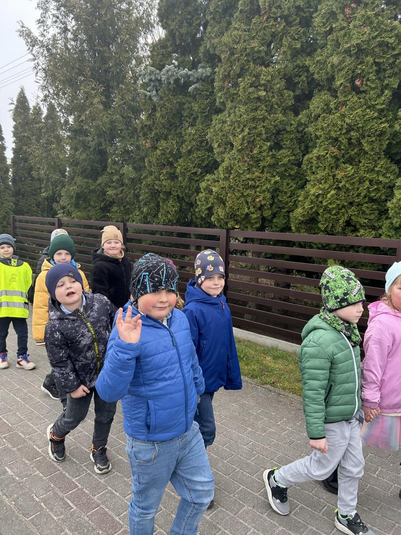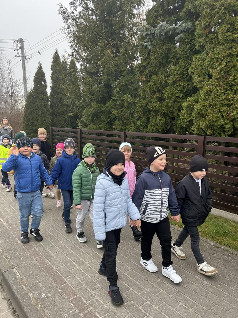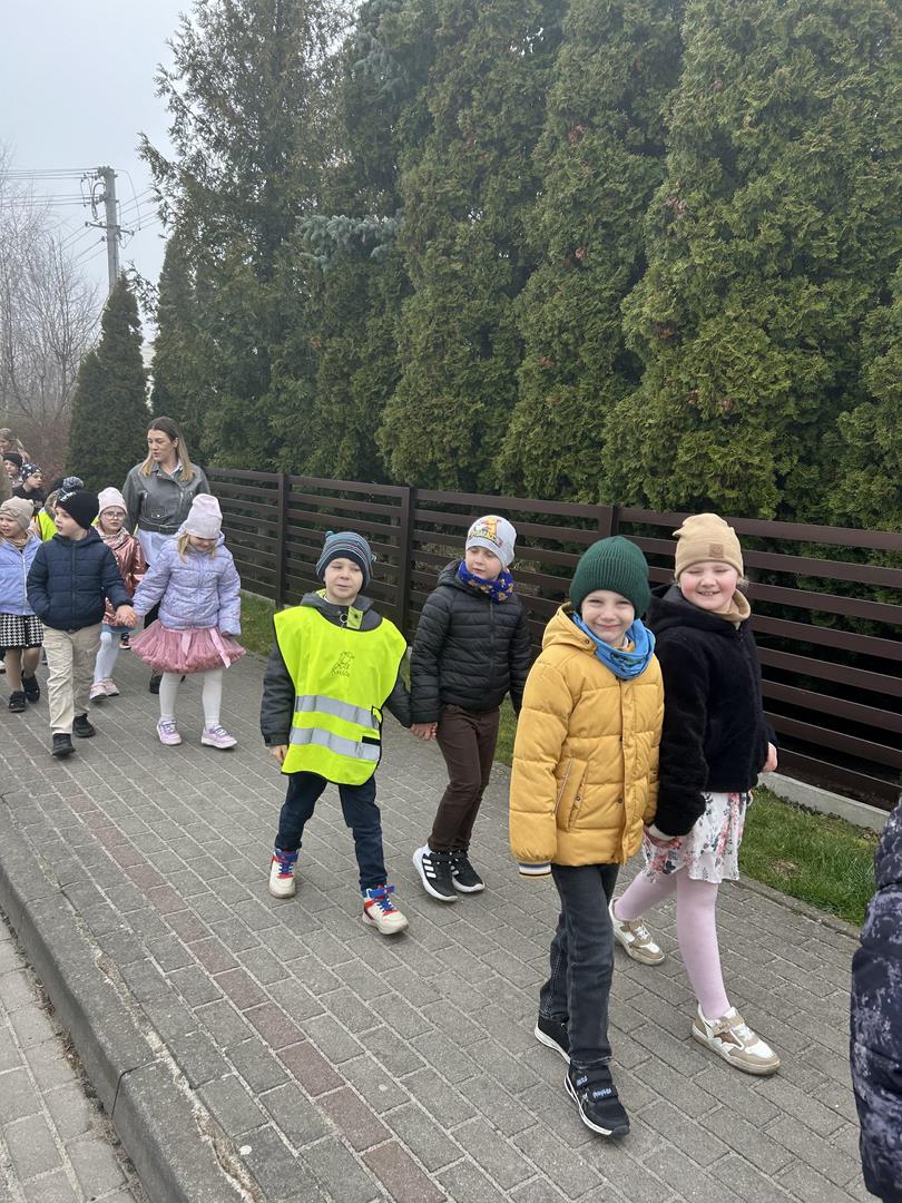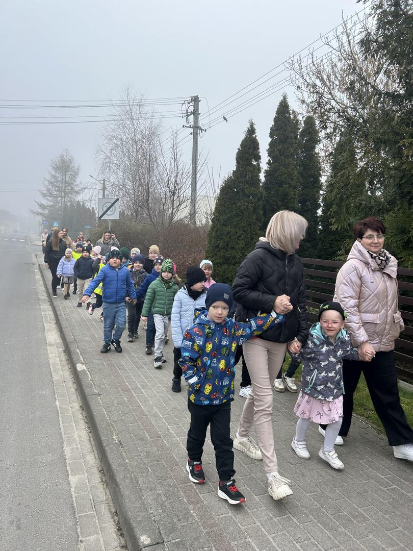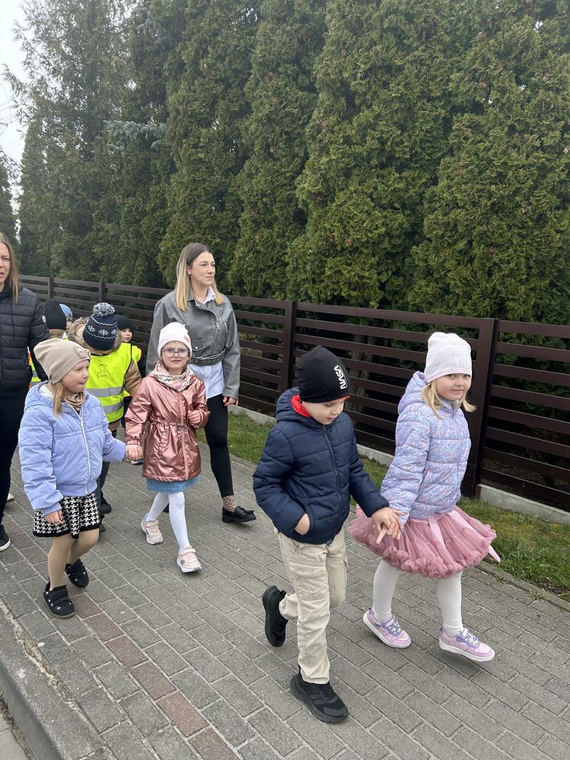 Z ogromną ciekawością i radością przedszkolaki wyruszyły na spacer, podążając śladami Zajączka. Podczas drogi dzieci wypatrywały wskazówek i nasłuchiwały, czy gdzieś w pobliżu nie kryje się ich niezwykły gość.